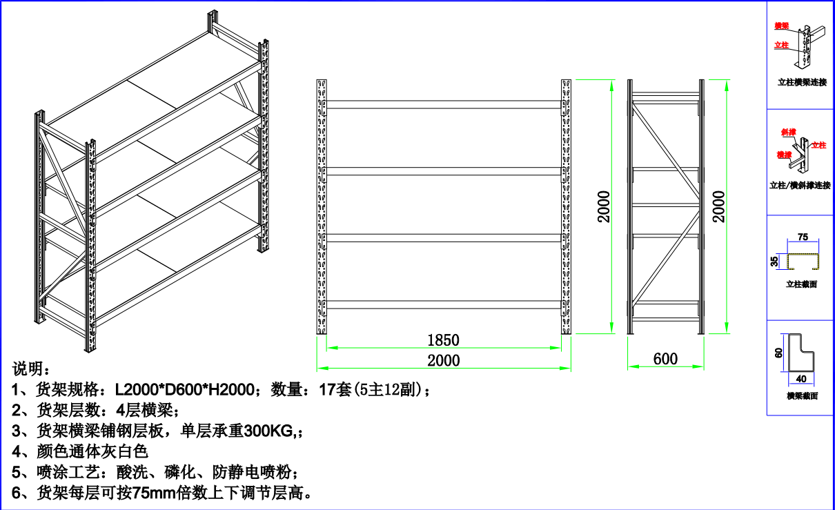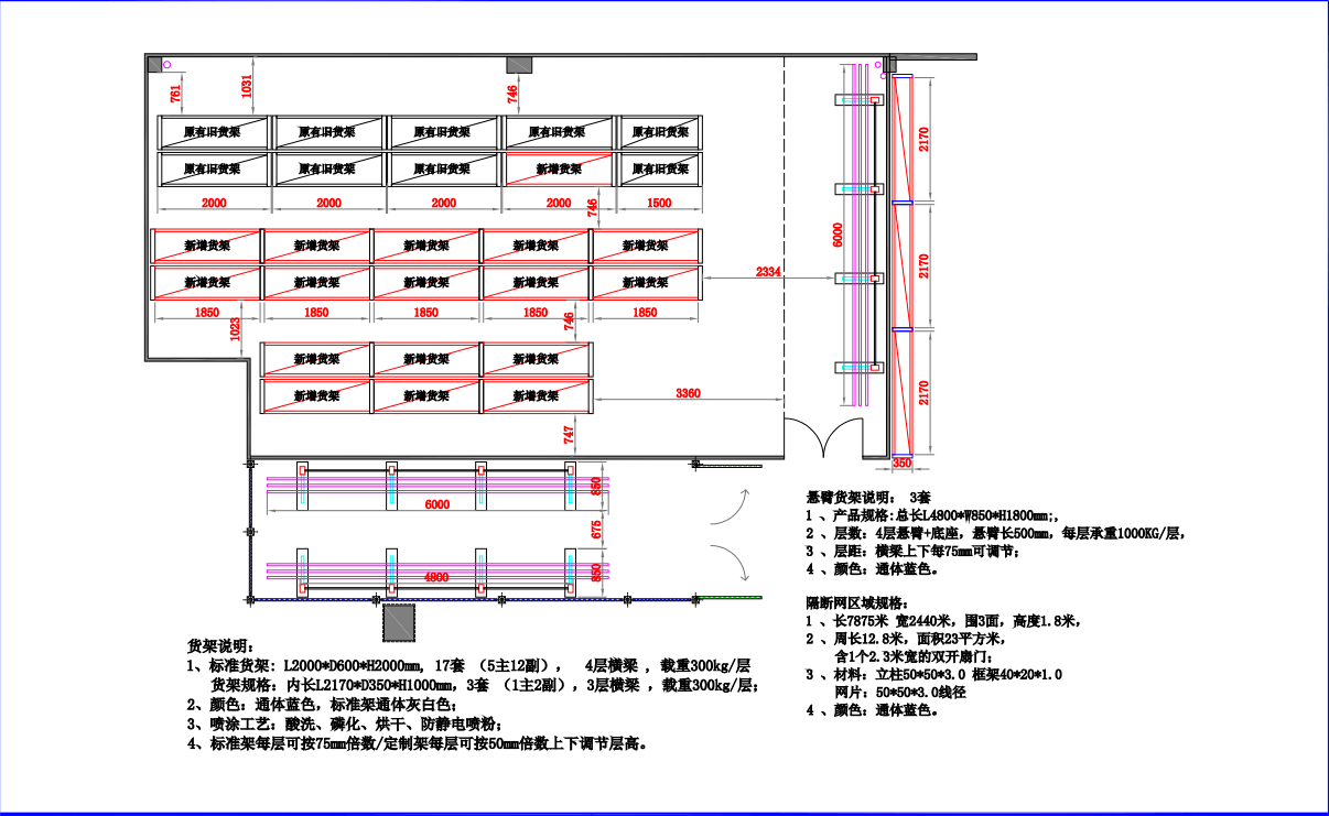 貨架說明:標準貨架 L2000*W600*H2000 5主12副 4層橫梁 載重300KG/層 貨架規(guī)格:內(nèi)長L2170*W350*H1000 顏色:通體藍色,標準貨架灰白色 3、噴涂工藝:酸洗、烘干、防靜電噴涂 標準貨架每層可按75mm倍數(shù)/定制架每層可按50mm倍數(shù)上下調(diào)節(jié)層高。