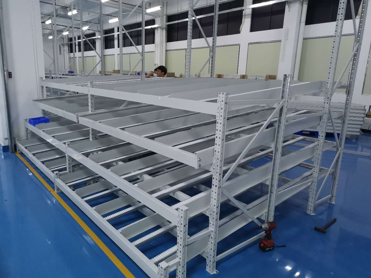流利式貨架根據組成貨架的基本框架的材質可分為重型流利式貨架和中B型流利式貨架。流利貨架的流利條直接連接到前后橫梁及中間支撐梁上,橫梁直接掛在支柱上,流利條安裝傾斜度取于貨箱的尺寸、重量以及流利架的深度,通常取5%~9%。當滾道較長時,可用分隔板將滾道隔開。取貨端需安裝制動片使貨物減,降低沖擊。